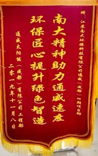 南大精神助力通威速度 環(huán)保匠心提升綠色“智”造——南大環(huán)保受到通威太陽能(成都)有限公司表彰近日,江蘇南大環(huán)保科技有限公司收到通威太陽能(成都)有限公司的錦旗和表彰信,南大環(huán)保在年產(chǎn)3.8GW高效晶體硅太陽能電池互聯(lián)...